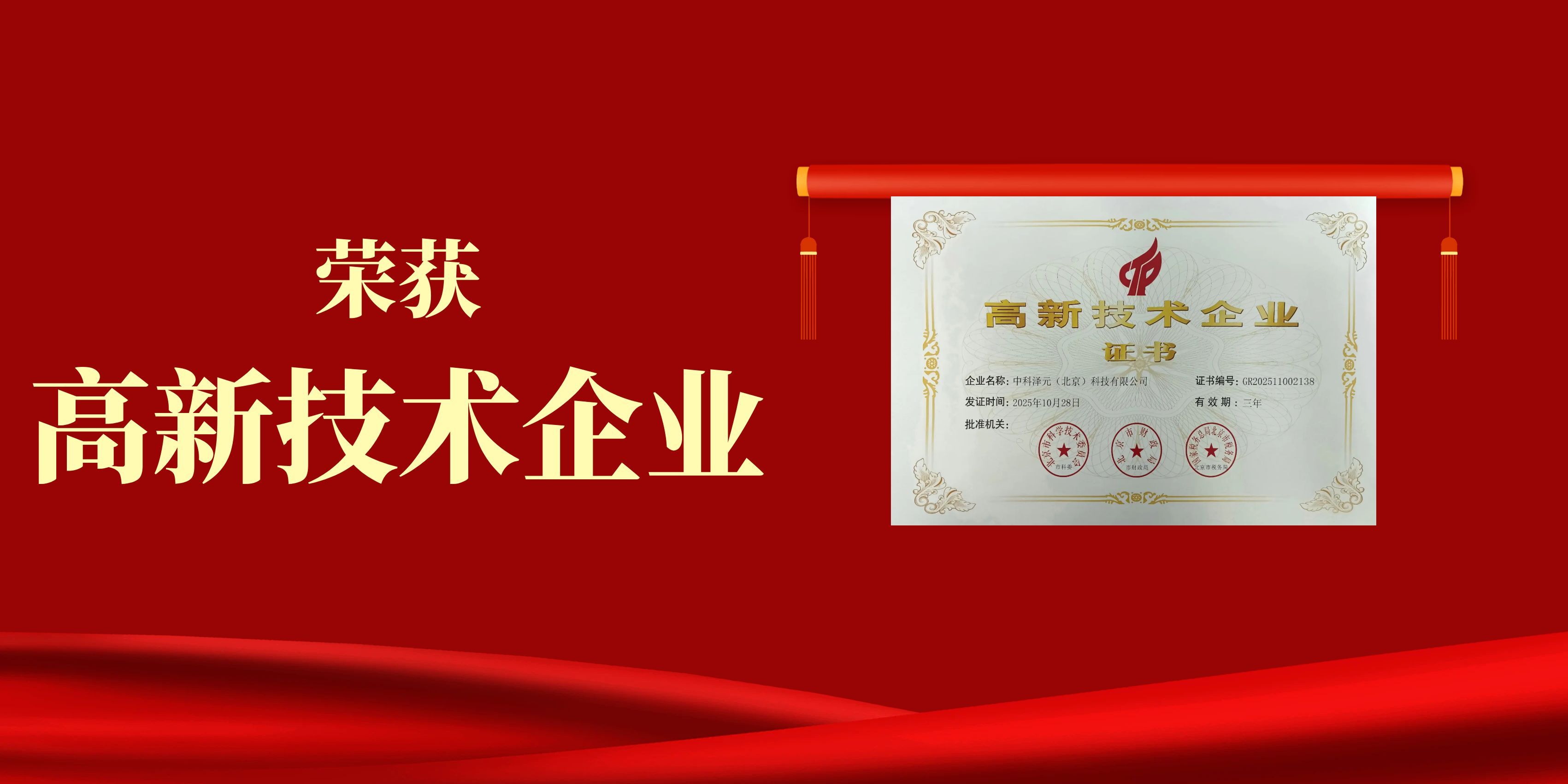 2025年10月,经北京市科学技术委员会、北京市财政局、国家税务总局北京市税务局的严格联合评审,中科泽元成功荣获“高新技术企业”证书。